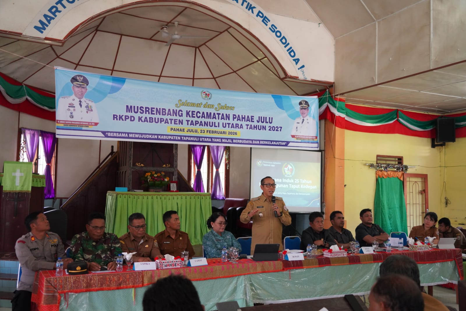 Indonesiainews.com||Taput – Bupati Tapanuli Utara Dr. Jonius Taripar Parsaoran Hutabarat, S. Si., M. Si didampingi Ketua TP PKK Ny. Neny Angelina JTP Hutabarat secara resmi membuka Musyawarah Perencanaan Pembangunan (Musrenbang) Kecamatan Pahae Julu yang dilaksanakan di Gereja HKBP Lumban Garaga, Pahae Julu, Senin (23/2/2026).