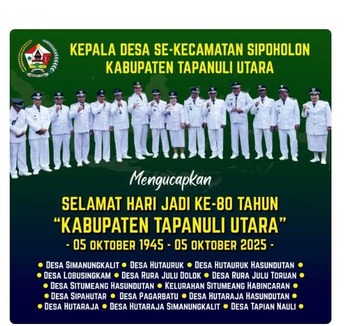 Melalui sebuah poster ucapan resmi, para kepala desa menampilkan kekompakan mereka dalam menyampaikan selamat ulang tahun kepada Kabupaten Tapanuli Utara yang berdiri sejak 5 Oktober 1945 hingga 5 Oktober 2025. Penampilan mereka dengan seragam dinas putih mencerminkan kedisiplinan, kebersamaan, dan dedikasi terhadap pelayanan publik.